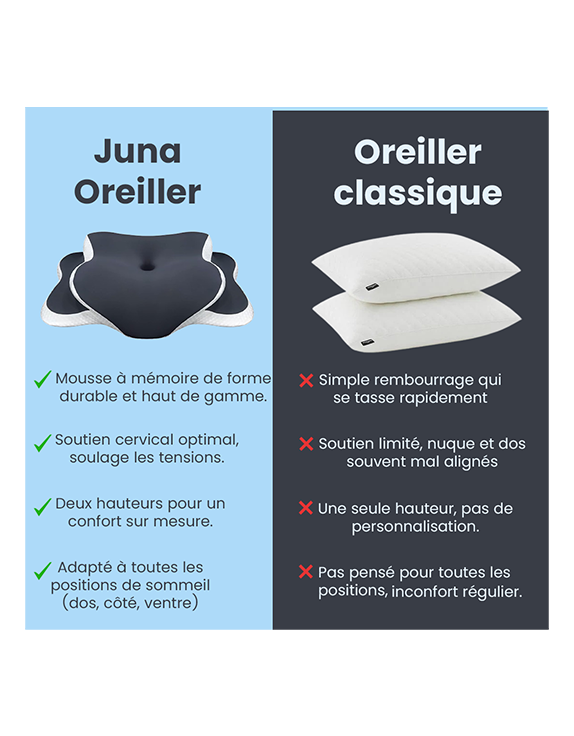 Oui. En aidant à maintenir un bon alignement de la tête, du cou et de la colonne vertébrale, Juna Oreiller favorise une posture plus naturelle pendant la nuit. Sa mousse à mémoire de forme réduit les points de pression, améliore le confort, facilite la détente et peut ainsi contribuer à un endormissement plus facile, moins de réveils nocturnes et des nuits globalement plus reposantes.
